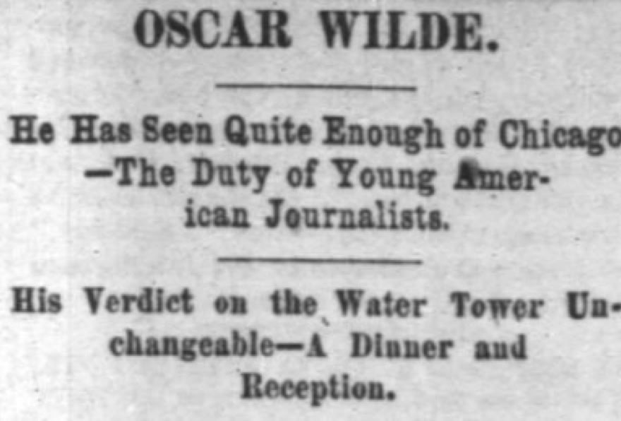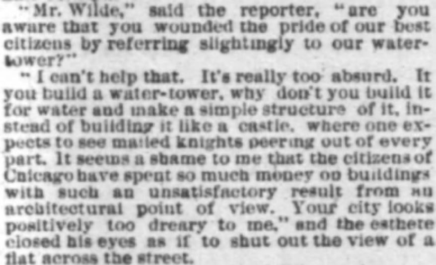 The following day Wilde was interviewed by the Tribune. The reporter put it to him that he had wounded the pride of Chicagoans by slighting the tower. Wilde was unrepentant: