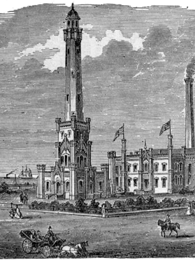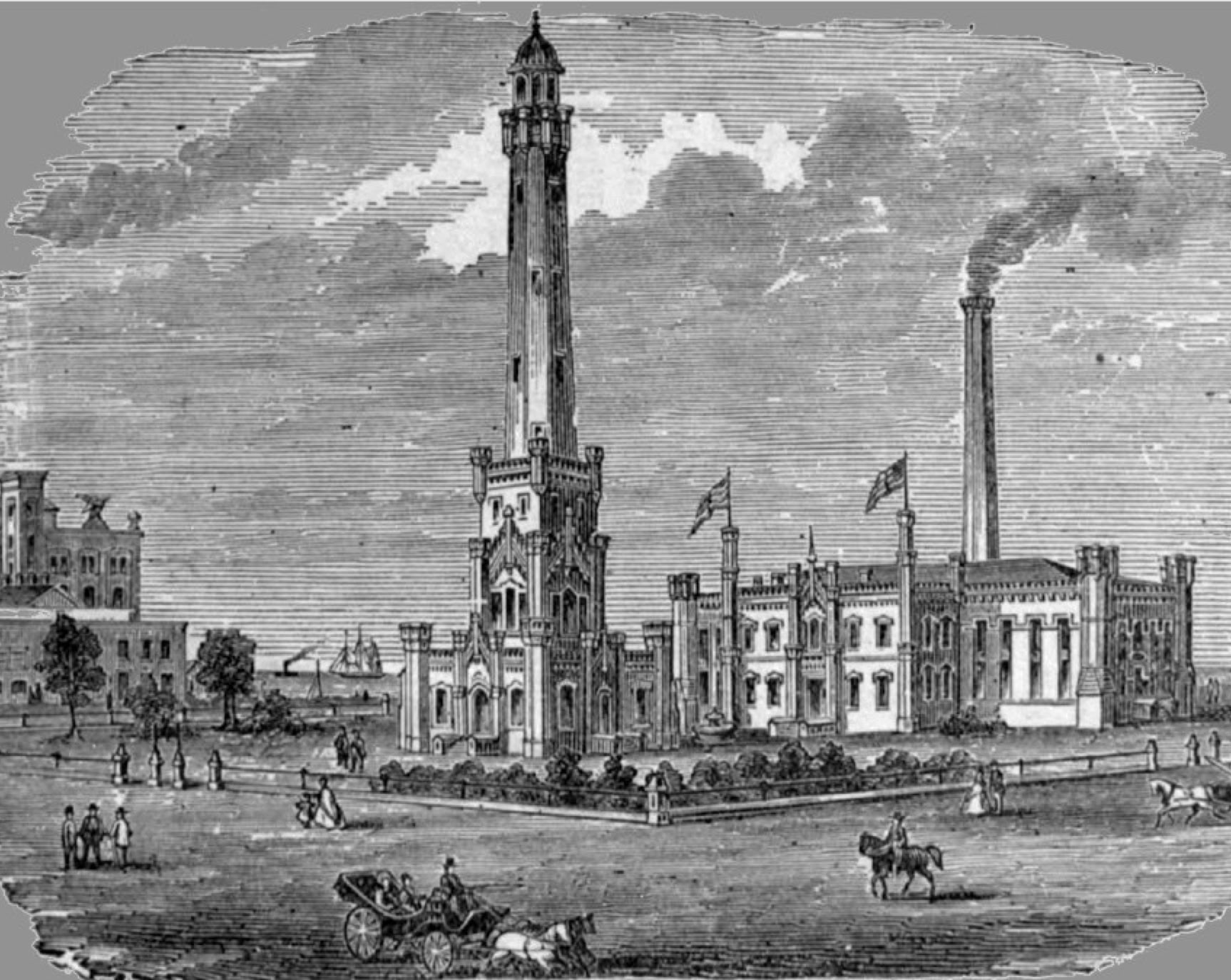 Chicago Water Tower and Chicago Avenue Pumping Station, in the 1880s. Lake Michigan visible in the distance.