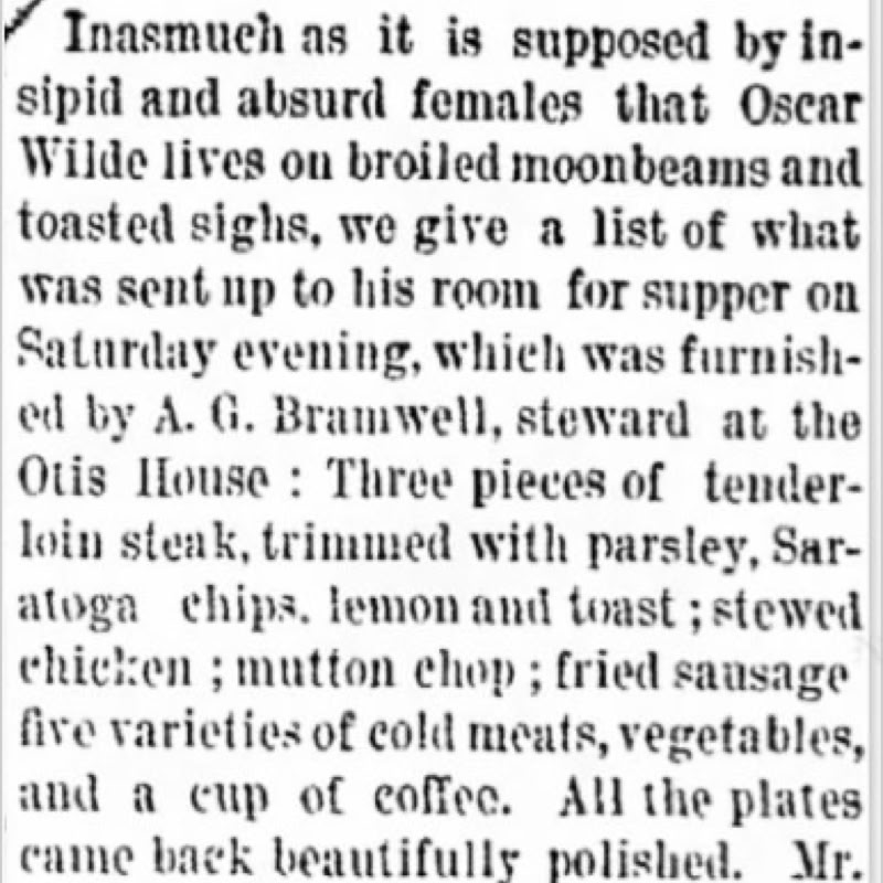 The report opposite states that Wilde’s supper was furnished by the steward at the Otis House, but this is not conclusive evidence that he stayed there—as there are others example of Wilde having food sent in.