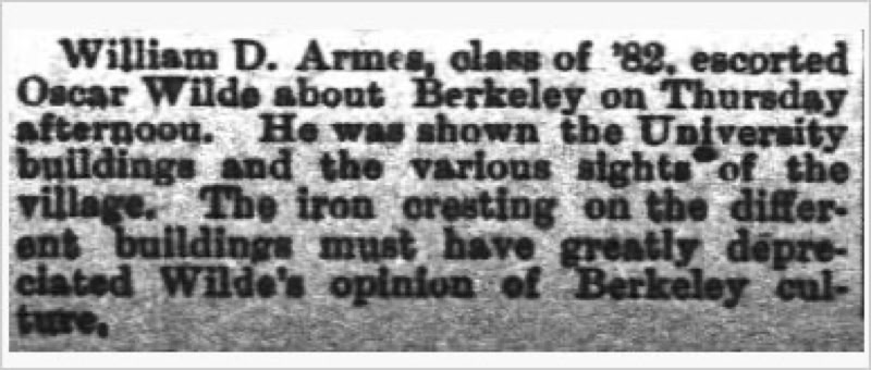 The photograph shows Berkeley alumnus William D. Armes in his retirement. But at the age of 22 (Class of 1882) Armes was described by the campus newspaper as the brilliant young local apostle of Wilde, and he duly served as host when Oscar toured the Berkeley campus on March 30, 1882.