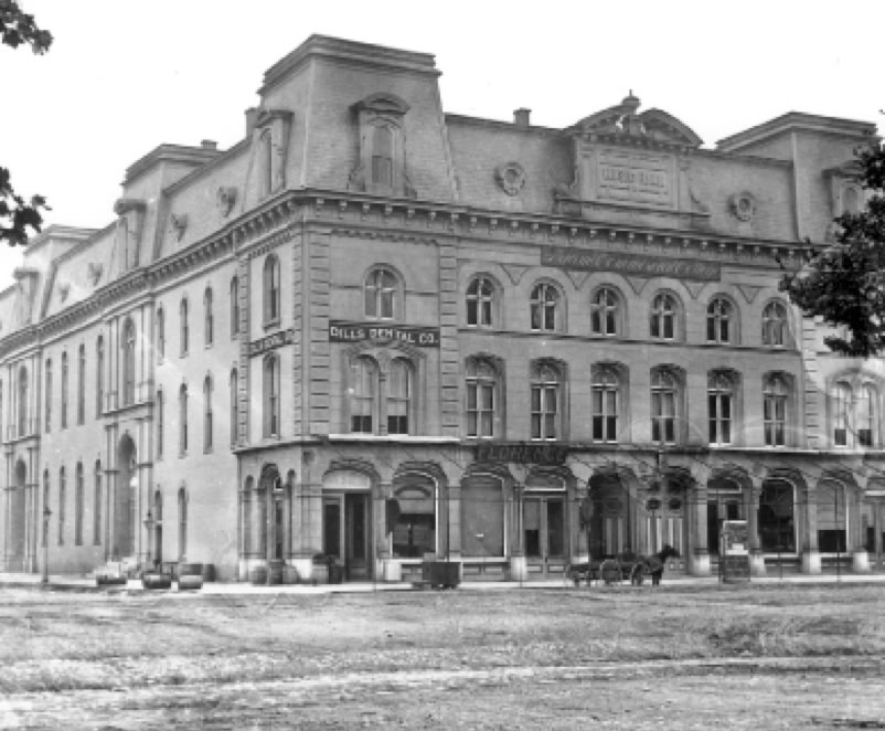 Premises: when the six-story Turner Opera House (1866) was destroyed by fire on May 16, 1869, a three-story edifice was rebuilt incorporating only a part the surviving facade of its predecessor; it resumed operations as the Music Hall