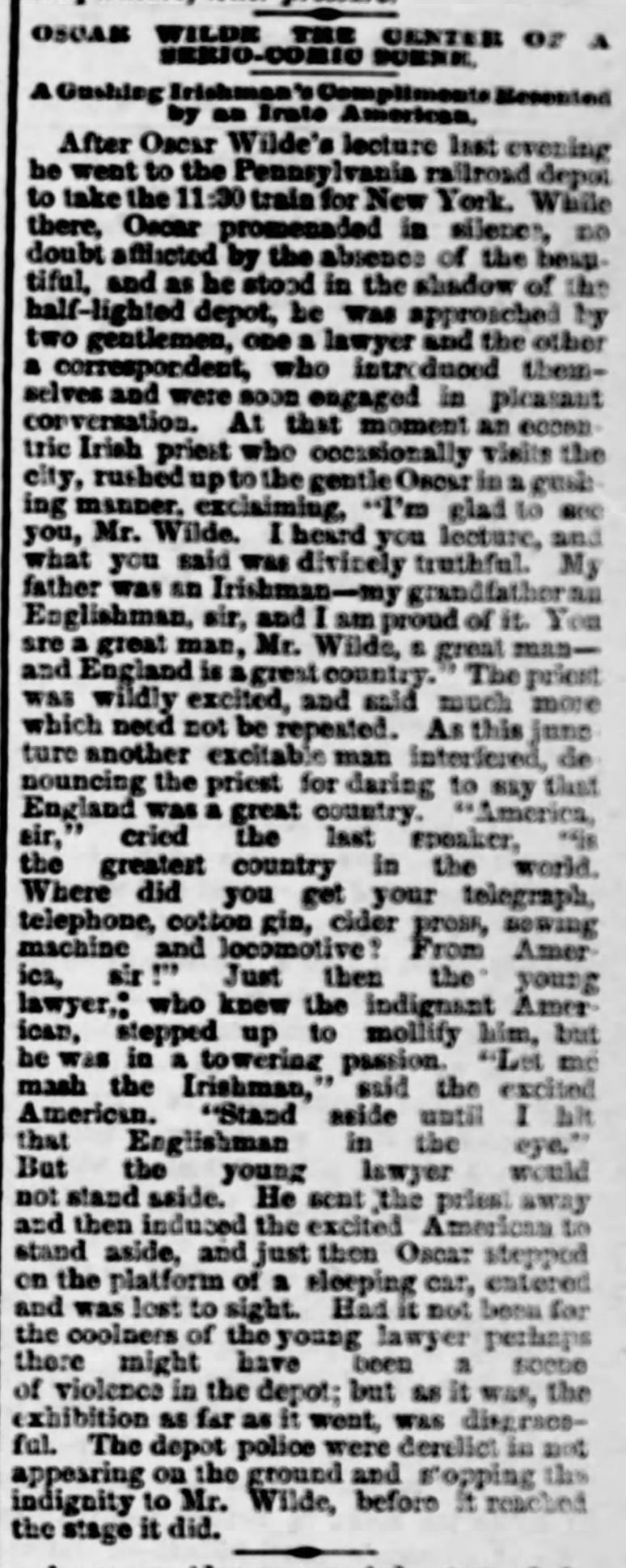 Wilde took rooms at a hotel to change and rest, something he often did even if not staying overnight, as was the case in Harrisburg. After the lecture Wilde returned to his rooms and gave an interview to the Harrisburg Telegraph before catching the 11:30 PM train to New York. (See story below under Ephemera).