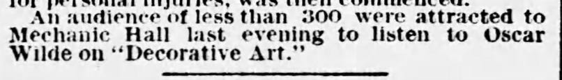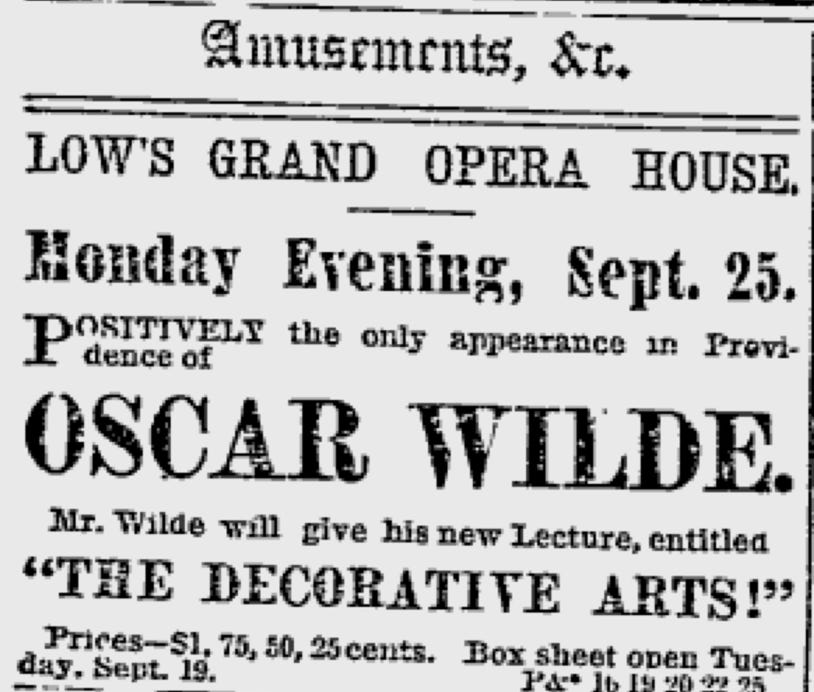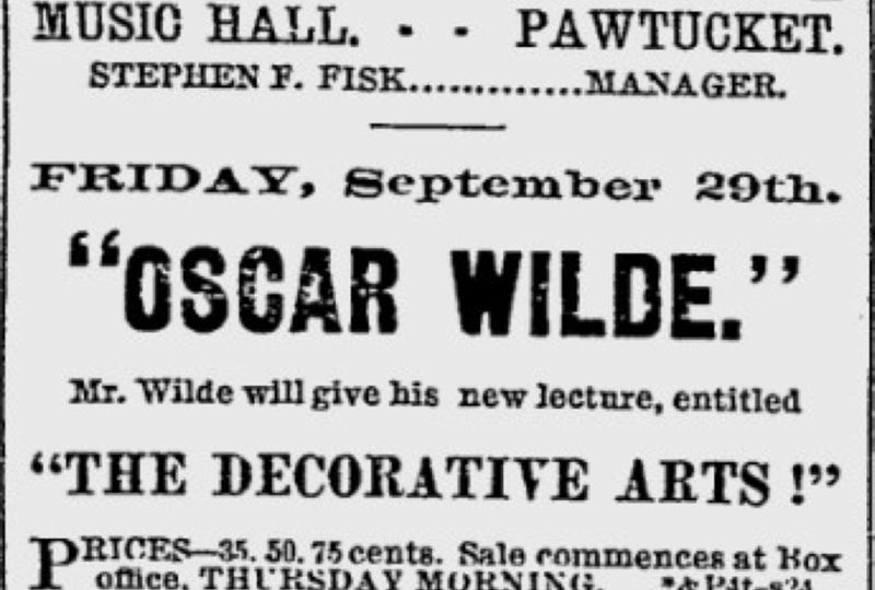 "What's coming? Oscar Wilde, to be sure. Coming! He is here in fact, and will deliver his lecture on 'Decorative Arts' in Wamsutta Opera House this evening ...