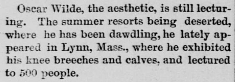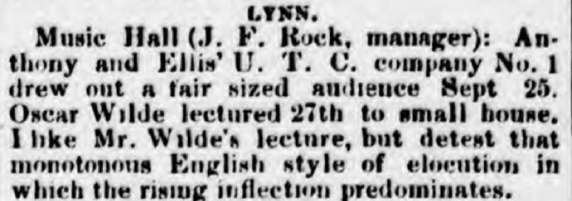 Previous chronologies are typically in error about the dates of Wilde’s lectures around this time, and only one (Beckson) records a lecture in Lynn, MA, while no account of Wilde’s lectures records an appearance in Salem, MA. However, the historical record alludes to both.