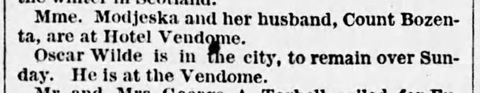While residing in the Boston area during this period, and probably while lecturing nearby, Wilde stayed at the Vendome Hotel, as he had done on a previous visit to Boston to lecture in January. For instance, the Boston Globe noted Wilde staying at the Vendome on October 1 when, coincidentally, the actress Helen Modjeska was also staying there. As it was she who had wondered in 1880 what Wilde was famous for, she was probably by now finding out.