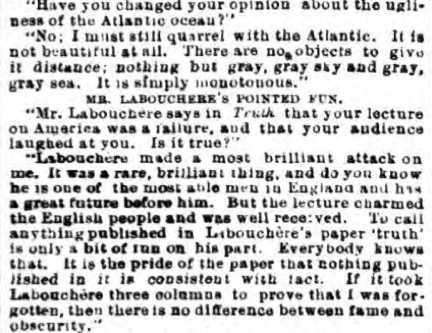 He was then asked about Henry Labouchère's magazine Truth, that had printed parodies of Wilde's original "disappointed" remark and commented unfavorably on his tour. Wilde replied smartly that Truth is not consistent with fact, before adding the quotation above that cleverly turns the tables on Labouchère.