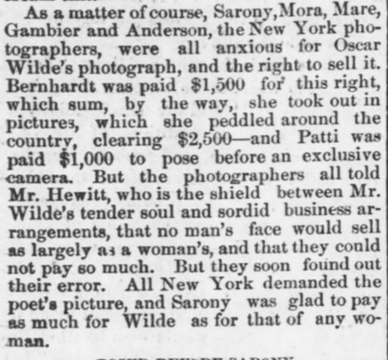 Typically, commercial photographers like Sarony paid celebrities for their image, and it has been asserted that Wilde waived this fee. This newspaper cutting suggests otherwise.