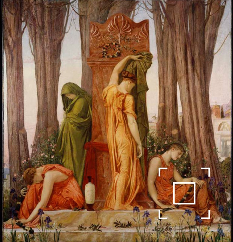 As the caption attests, the treatment of the composition is in homage to W.B. Richmond's "Electra at the Tomb of Agamemnon " (1874), a painting that Wilde had described in detail in his review [1] of its showing at The Grosvenor Gallery in London.