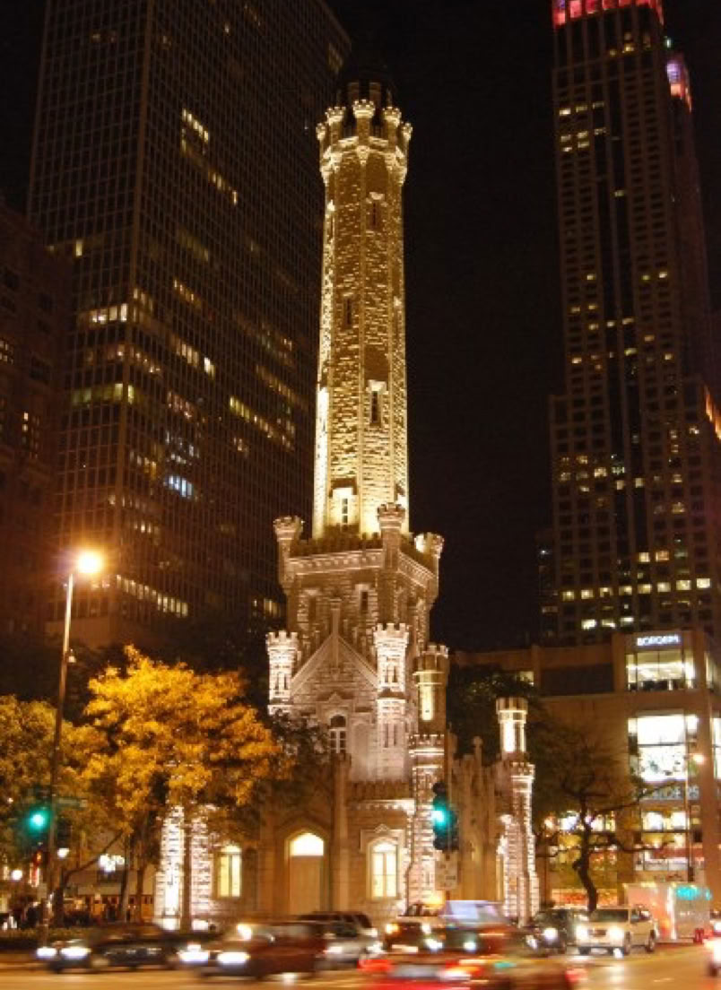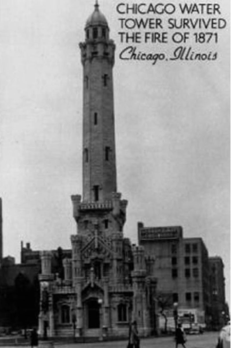 Chicago Water Tower and Chicago Avenue Pumping Station, in the 1880s. Lake Michigan visible in the distance.