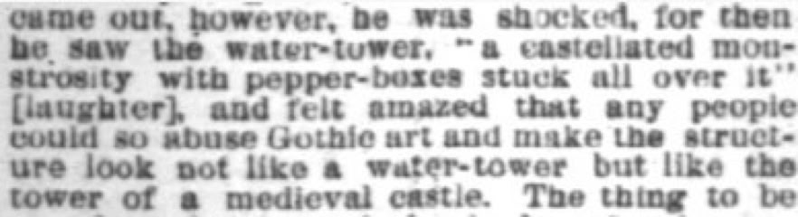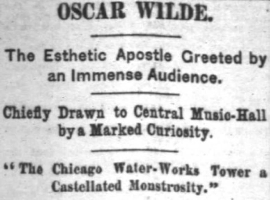 In his lectures, Wilde often included local references, where possible, and while in Chicago he took the opportunity to comment on Chicago's imposing (154 feet) 1869 water tower which he called "a castellated monstrosity with pepper-boxes stuck all over it".