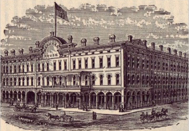 Markham House (#28) in the center is the U-shaped building adjacent to the railroad terminal.
