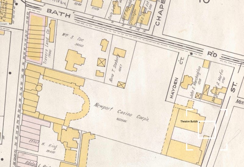 The theatre was a separate building to the rear of the site. It survives, and is now located at 10 Freebody St., Newport, RI 02840.