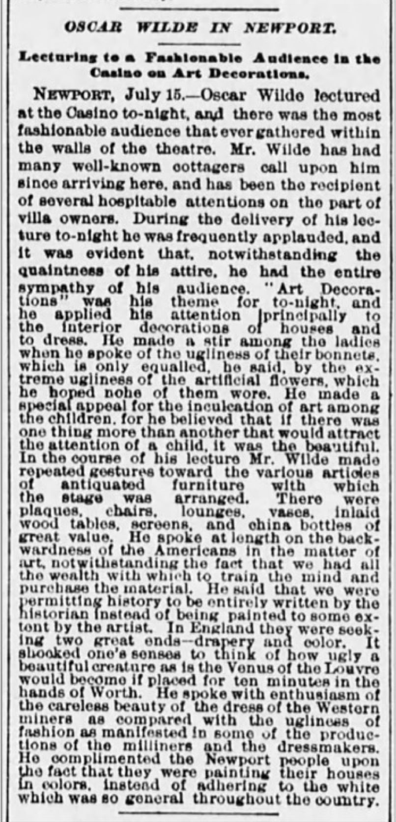 Wilde spent six days in Newport, and stayed at least one night (July 14) at āOak Glenā, the Summer home of Julia Ward Howe, who had earlier received Wilde at her Boston home that year.Ā