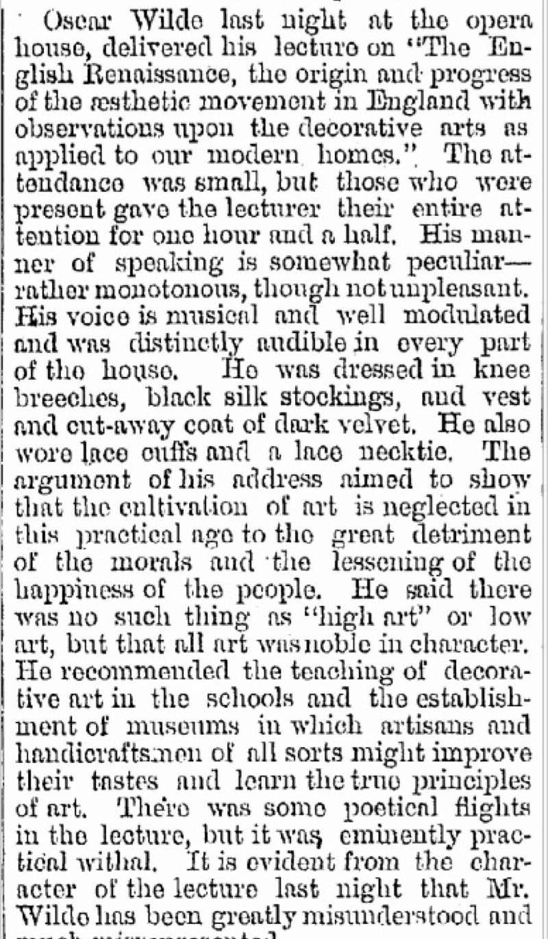 Wilde took rooms at a hotel to change and rest, something he often did even if not staying overnight, as was the case in Harrisburg. After the lecture Wilde returned to his rooms and gave an interview to the Harrisburg Telegraph before catching the 11:30 PM train to New York. (See story below under Ephemera).
