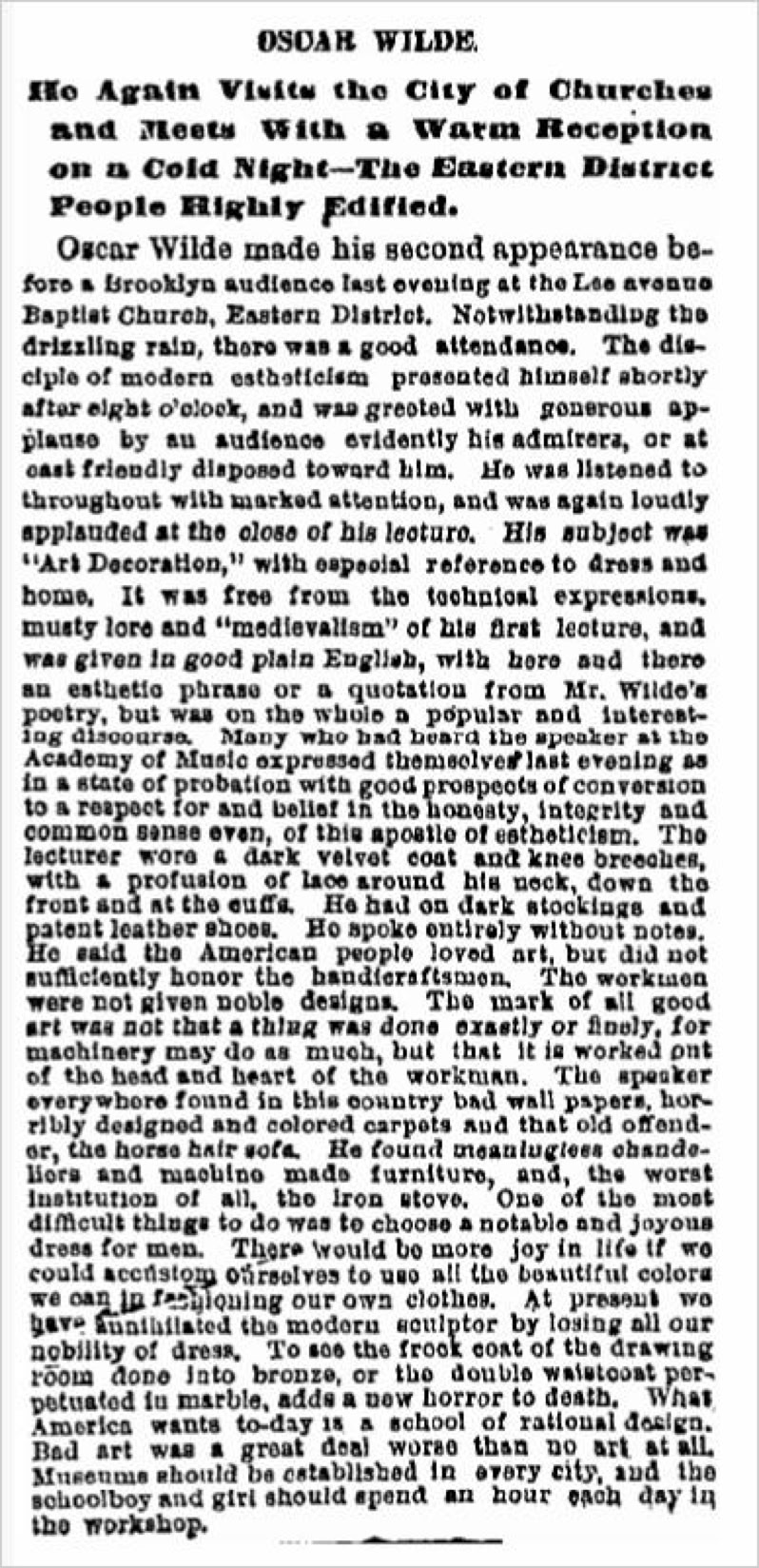 * After the church closed in July 1881 (services moved to the All Souls' Universalist Church), it did not reopen officially as a theater until October 1882. Wilde lectured in the old audience room of the church.