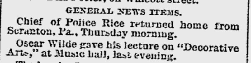 Previous chronologies are typically in error about the dates of Wilde’s lectures around this time, and only one (Beckson) records a lecture in Lynn, MA, while no account of Wilde’s lectures records an appearance in Salem, MA. However, the historical record alludes to both.